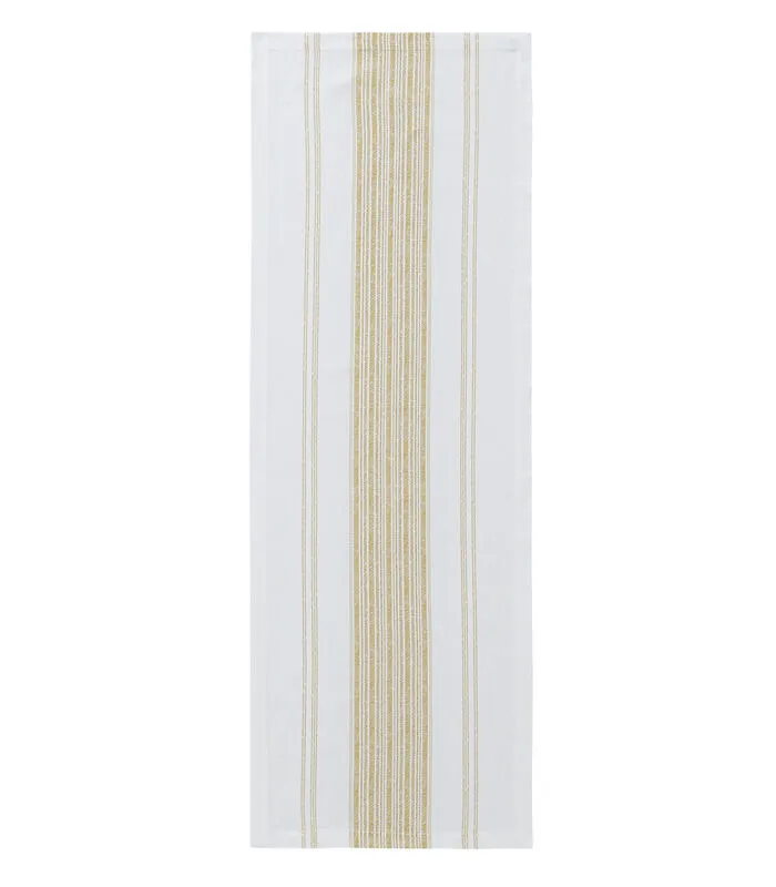 Amalfi, tafellinnen in het midden bedrukt met strepen die zijn opgebouwd uit kleine visgraatmotieven. De onberispelijke afwerking met een enkele zoom en verstekhoeken van 3 cm maken dit product helemaal af.