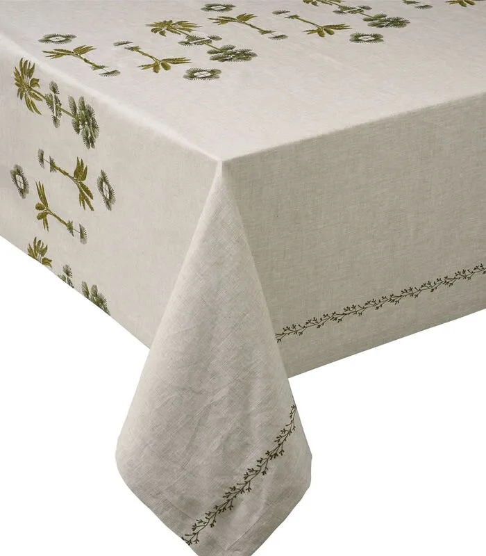 Ontdek ons tafellaken BARBADE van effen geborduurd linnen! De sterk grafische motieven van verschillende soorten palmbomen en –planten zoals de reizigersboom komen uitstekend tot hun recht door deze decoratieve borduurtechniek.