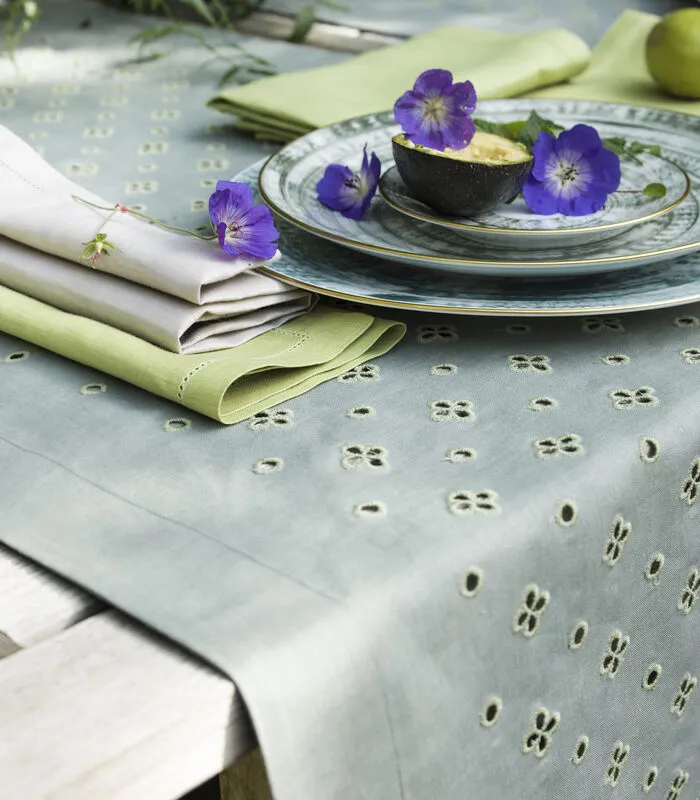 Luxembourg, tafellinnen met in het midden prachtig geborduurd ajourwerk. De stippeltjes en kleine bloemetjes met hun mooie ronde vormen zijn geĂŻnspireerd op vintage metalen tuinmeubelen.