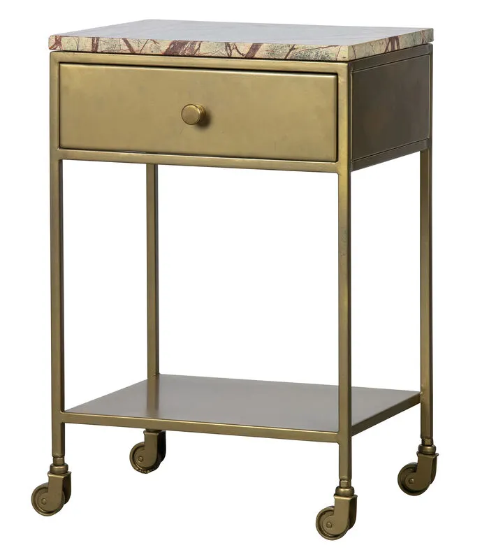 Dit stijlvolle nachtkastje komt uit de collectie van het Nederlandse merk BePureHome. Het Clinic nachtkastje is vervaardigd uit sterk metaal met een warme atique brass finish. Het 2 cm dikke blad is van meerkleurig Bidasar marmer, wat zorgt voor een luxe uitstraling. Clinic heeft vier zwenkwieltjes, waardoor je het nachtkastje eenvoudig verplaatst. De zwenkwielen zijn niet voorzien van een rem.