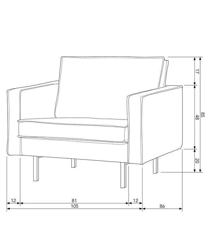 De Rodeo fauteuil heeft een totale hoogte van 85 cm, breedte van 105 cm en diepte van 86 cm. De zithoogte is 45 cm en een zitdiepte van 60 cm zorgt voor een fijn ondersteunende zit. De zitbreedte van deze fauteuil bedraagt 81 cm en heeft een los zit– en rugkussen. De armleuningen hebben een breedte van 12 cm en een hoogte van 68 cm, gemeten vanaf de vloer. De metalen poten zijn 20 cm hoog. De fauteuil kan 120 kg dragen.