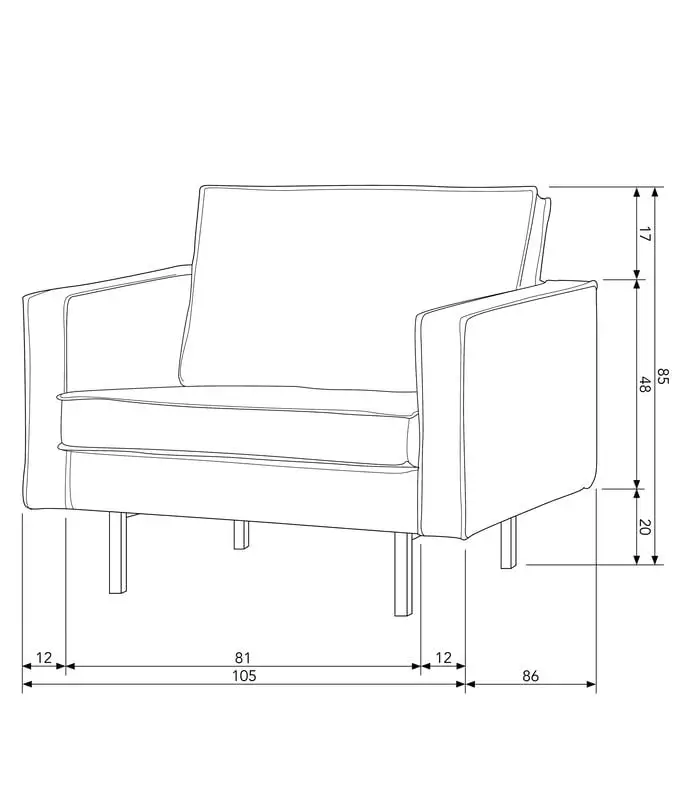 De Rodeo fauteuil heeft een totale hoogte van 85 cm, breedte van 105 cm en diepte van 86 cm. De zithoogte is 45 cm en een zitdiepte van 60 cm zorgt voor een fijn ondersteunende zit. De zitbreedte van deze fauteuil bedraagt 81 cm en heeft een los zit– en rugkussen. De armleuningen hebben een breedte van 12 cm en een hoogte van 68 cm, gemeten vanaf de vloer. De metalen poten zijn 20 cm hoog. De fauteuil kan 120 kg dragen.