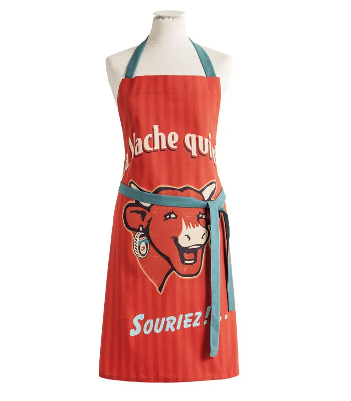 Dit schort in vintage stijl, het resultaat van de samenwerking tussen La Vache Qui Rit® en Coucke, is in het midden versierd met de beroemde, wereldwijd bekende rode koe in verschillende rode tinten.