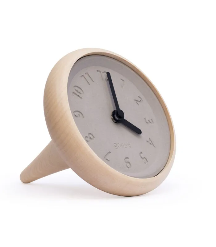 De tafelklok Toupie in ecologisch beton en Frans esdoornhout wordt gemaakt in Frankrijk en gedistribueerd door het ecologisch verantwoorde merk Gone’s. Subtiele combinatie van hout en beton, geïnspireerd door de knowhow van een ambachtelijke houtdraaier uit de Haute–Loire die dit materiaal al generaties lang bewerkt. De wijzerplaat is gemaakt in onze werkplaats in Lyon van ecologisch beton omdat het 100% mineraal– en chemicaliënvrij is. Deze versie heeft blauwe naalden.