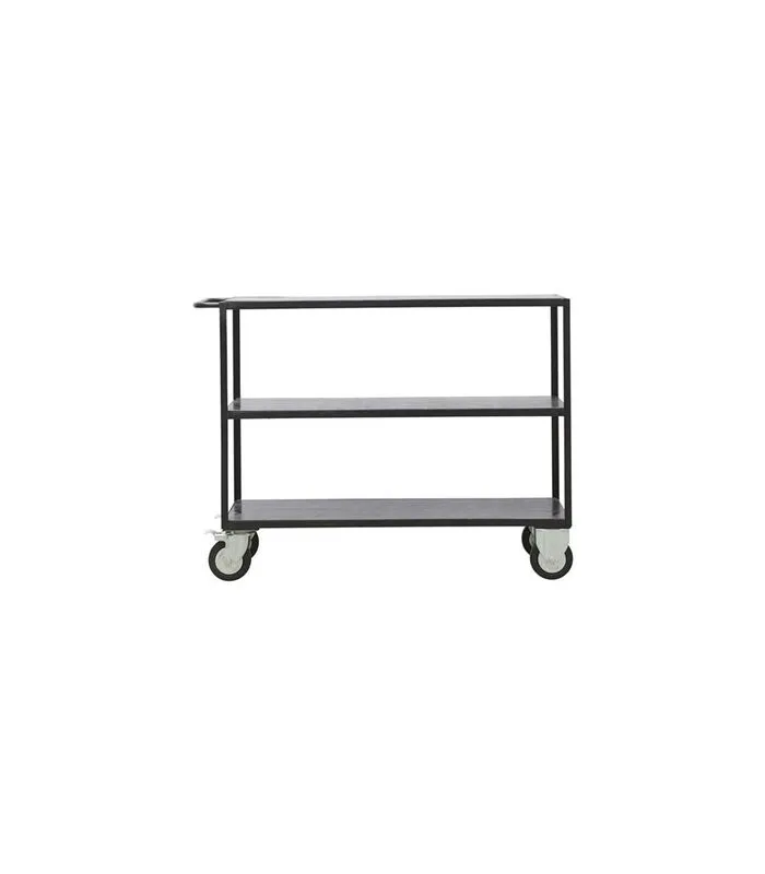 Dit leuke meubel van House Doctor is een trolley met planken, vier wielen en op vele manieren te stylen. De planken zijn gemaakt van zwart multiplex en het frame is van ijzer. De zwarte kleur geeft de meubels een industriële en minimalistische uitstraling.