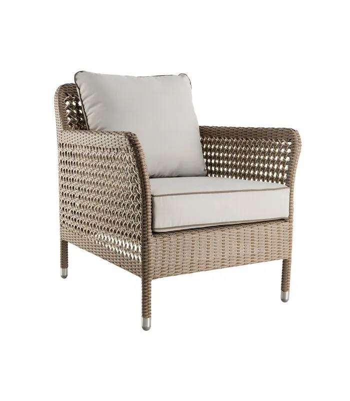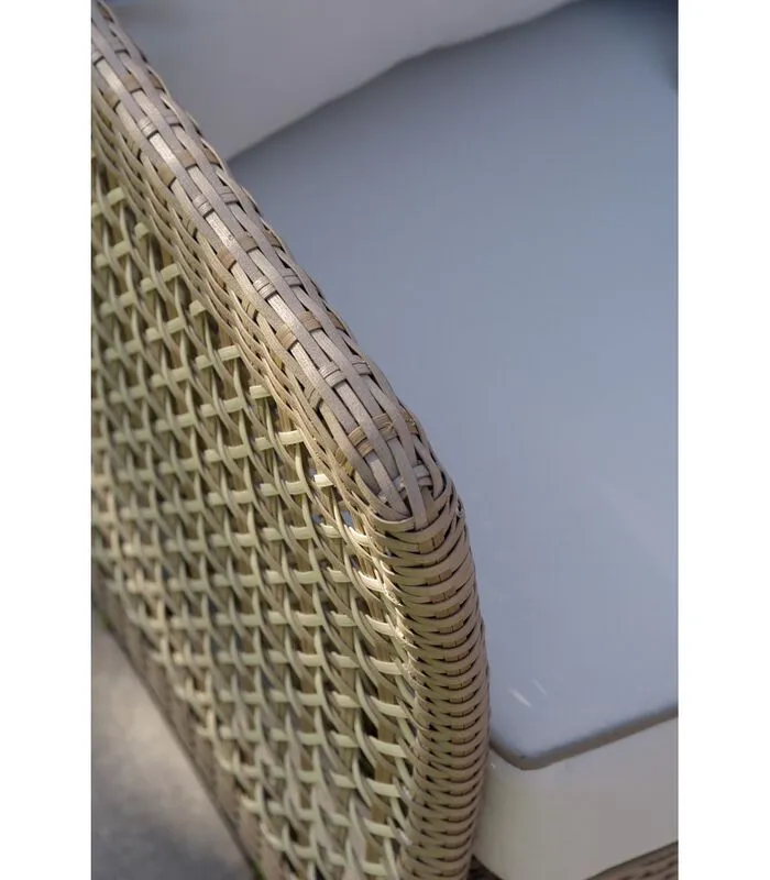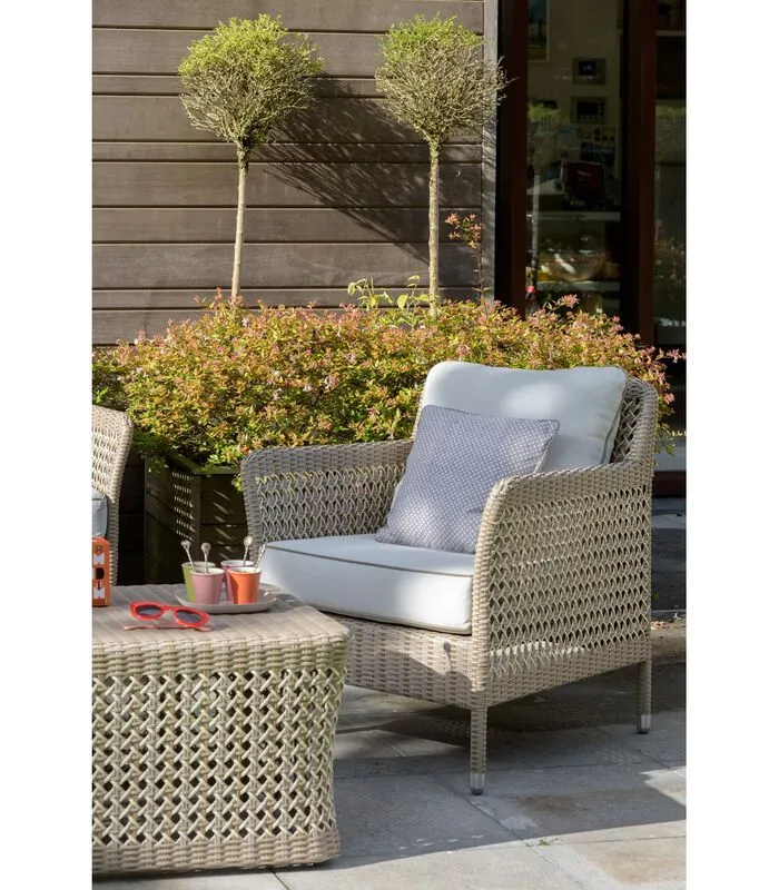 Eenvoudige en compacte lijnen voor deze fauteuil in Antibes KOK MAISON Kunstvezel, met een mooi vlechtwerk. Wij vervlechten drie kleuren resin om de wit/beige tinten van de riffen bij eb na te bootsen, dit alles in een vlechtwerk in de geest van het oude open weven. Deze collectie is overal te vinden en blijft zeer verfijnd, hij vindt natuurlijk zijn plaats aan zee, op oude teakhouten dekken, in chalets, in de bergen, of op de fiets. Dimensies: Hoogte 80 X breedte 66 X diepte 75 – zitting 41.Het kussen is gevuld met polyetherschuim 30kg/m3 voor de zitting en polyester watten voor de rugleuning. De stoel is geschikt voor gebruik buitenshuis: polyethyleenkunstvezel met hoge dichtheid; gegarandeerd tegen UV, slecht weer, grote temperatuurschommelingen (–15°C, +55°C), zout aan zee. Rattan specialist sinds 1920, KOK MAISON biedt kwaliteitsmeubelen, comfortabel en bestendig, niet alleen door de keuze van de materialen maar ook door de zorgvuldige zorg die aan elk detail van hun onderdelen wordt besteed. Constructie: Geluiddempend en hittebestendig: Structuur in gelakt aluminium. Weven in hoge dichtheid polyethyleen Kunstvezel. Kussen: 30kg/m3 polyethyleenschuim voor de zitting en polyester watten voor de rug. Stof 100% olefine