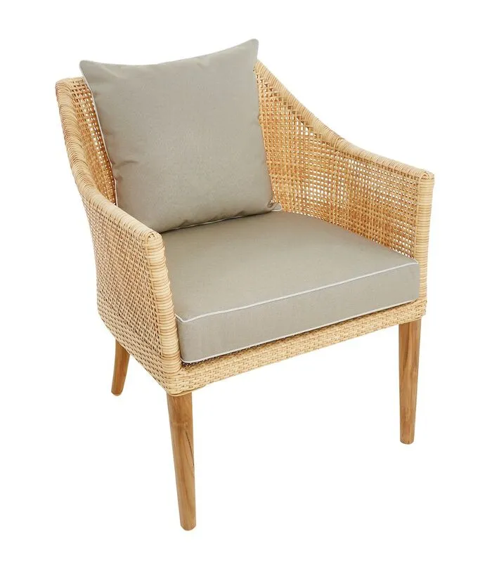 Poten in natuurlijk teakhout, aluminium frame. Gevlochten HDPE hars. Nylon glijder onder elk been. Afmetingen: H 75 x B 63 x D 68 cm. Zithoogte 44cm met kussen. Gewicht: 7,5 kg. Hier geleverd met uitneembaar kussen in polyetherschuim 30 kg/m3 voor de zitting en in polyestervezel voor de rug, 100% olefinic bruine stof, UV–, weer– en schimmelbestendig, koud wasbaar. Gemaakt in Indonesië (zitting en kussen). Het kussen kan op verzoek worden gestoffeerd met de stof van de klant. Neem contact met ons op voor details.