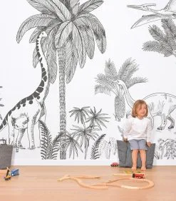 Behang, een mooie manier om de kinderkamer om te toveren. Door de mooie zwart met witte afbeelding is het behang vrij rustig en tijdloos.