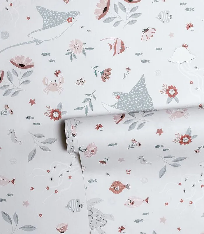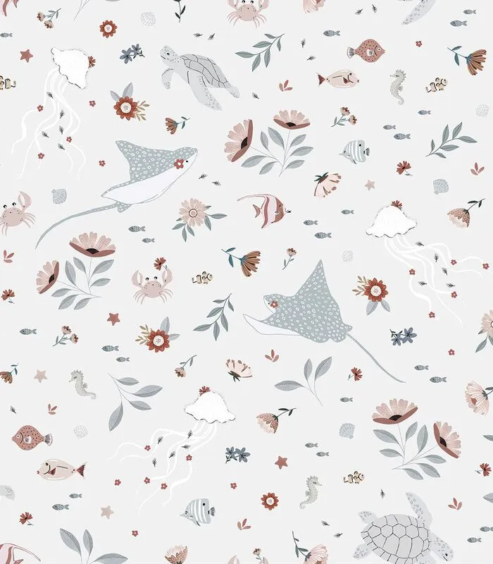 Neem een duik in de oceaan met de prachtige zeedieren die op het kinderbehang zijn afgebeeld. Het kinderbehang ”Ocean field” is van het merk Lilipinso.