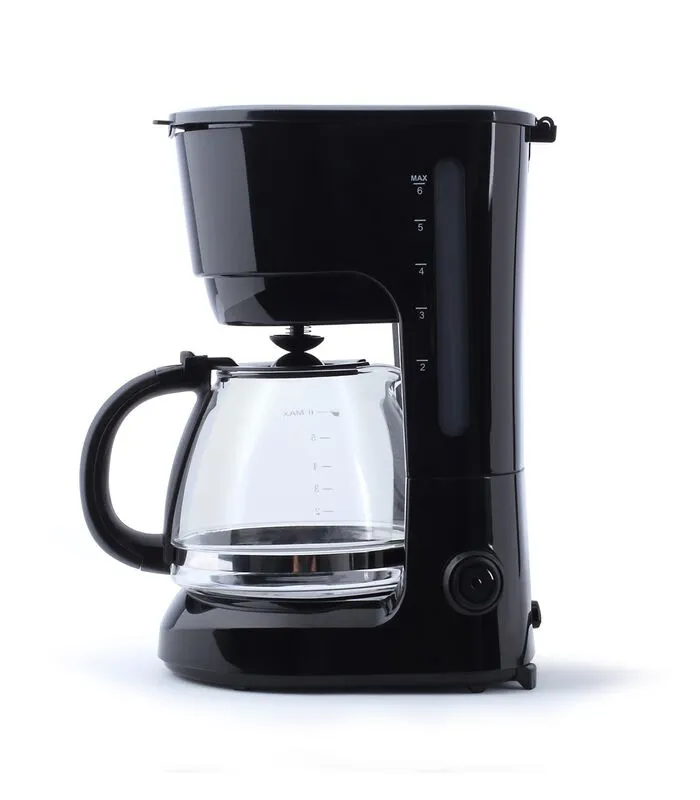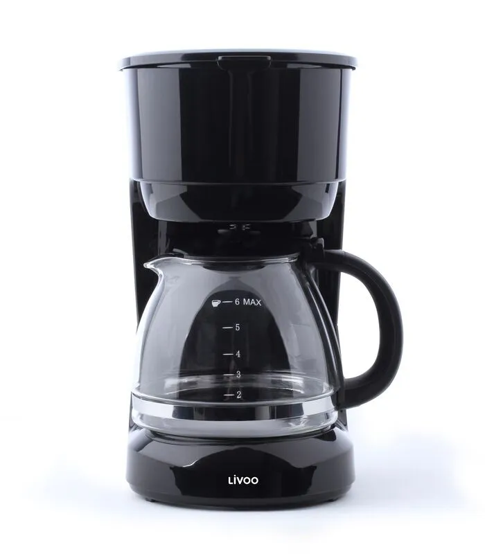 Capaciteit 6 kopjes. Anti–aanbaklaag, warmhoudplaat en warmhoudfunctie. Aan–/uitschakelaar met lichtindicator en auto–uitschakeling. Herbruikbare kegelfilter. Waterniveauindicator. Anti–druppelfunctie. Glazen kan.
