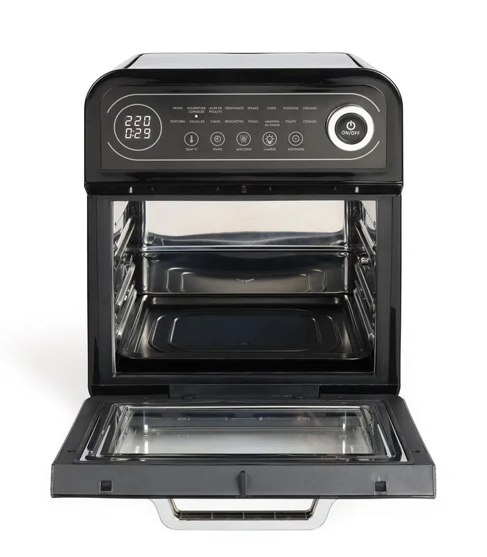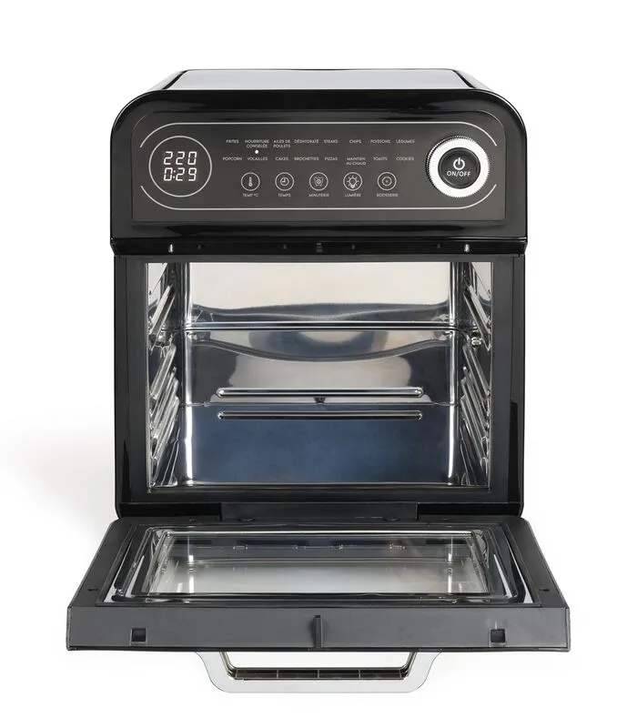 – 12 L inhoud– Koken met gepulseerde warmte– Instelbare temperatuur tot 220 °C– Digitaal display– 16 vooraf vastgelegde bereidingsprogramma’s– Grote capaciteit met 3 lades– Draaiknop voor traploze verstelling en tiptoetsenpaneel– Timer tot 60 minuten met geluidssignaal en automatische uitschakeling– 5 accessoires: Lekbak, rooster, gaasmand, braadtang, kooiklem