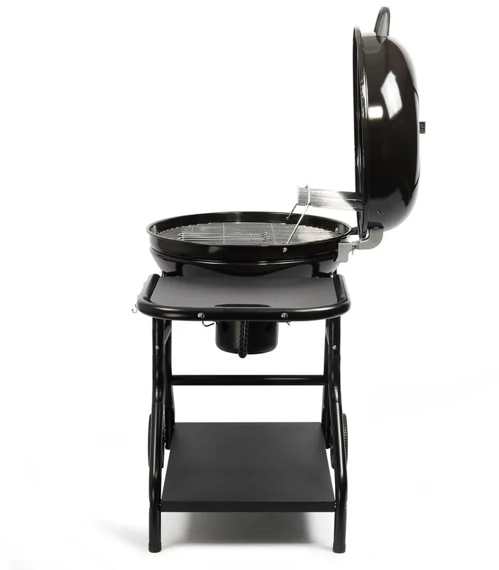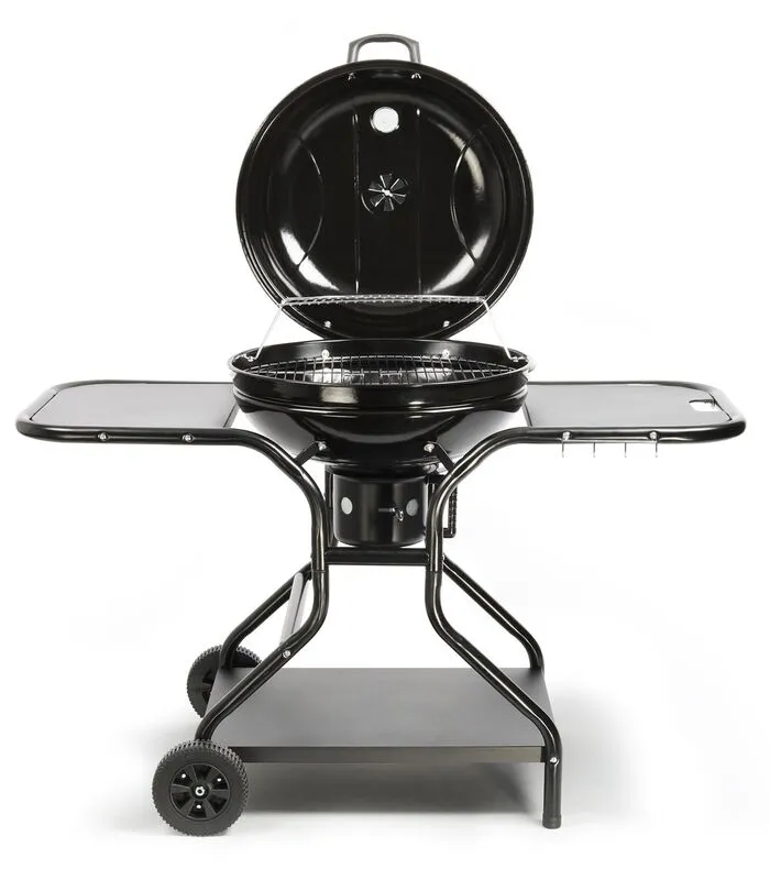 Zwartgelakte stalen tank en deksel. Kookoppervlak van 56 cm in diameter. Kookhoogte: 81 cm and 91 cm.Verchroomd grillrooster. Asverzamelaar. Zwartstalen opbergsysteem aan de onderkant. Ruimte voor gebruiksvoorwerpen. Eenvoudig te vervoeren dankzij wielen en draagbeugel.