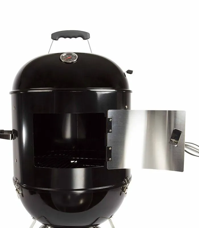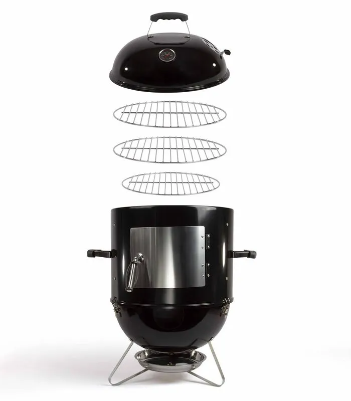 Rookoven 2 in 1 Kookrooster 44cm Geëmailleerde staalconstructie met handvatten Deksel met ingebouwde thermometer en ontluchtingsventiel Aluminum klepje voorkant Asverzamelaar Kan tevens als barbecue worden gebruikt