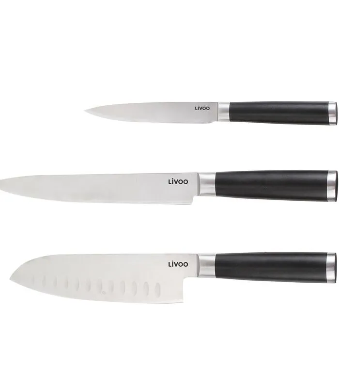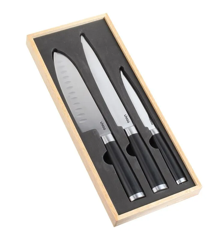 Set van 3 Japanse messen in een houten giftset. Santoku–mes (Japans koksmes) 18cm. Snijmes 20 cm. Allroundmes 12,5 cm. Roestvrij stalen messen.