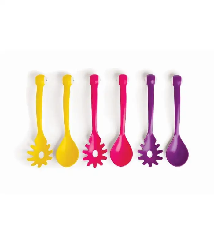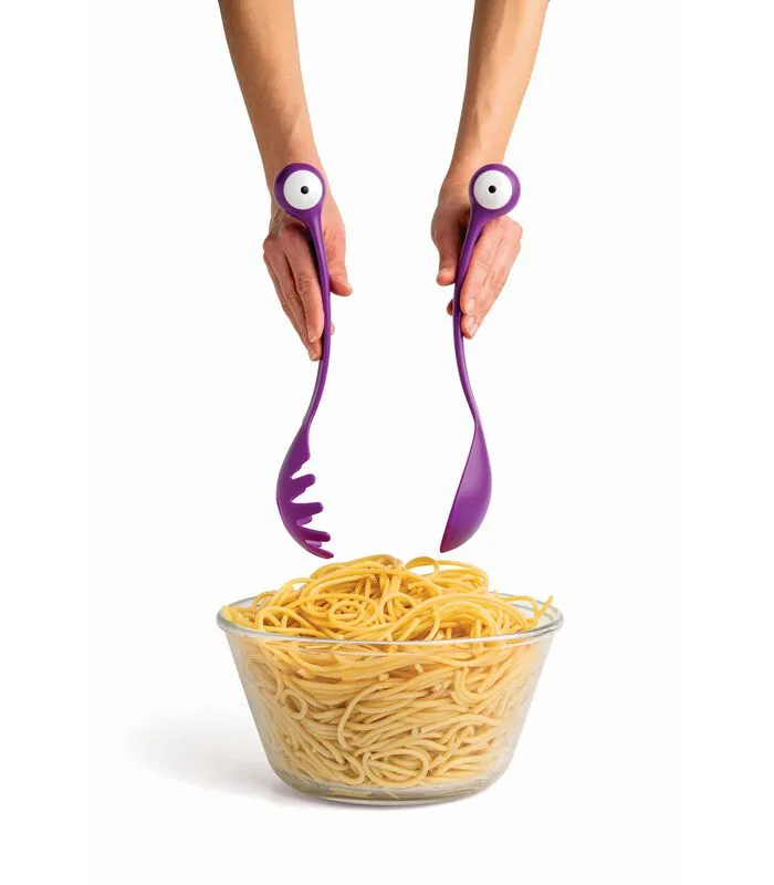 Rond etenstijd verschijnt langzaam het pasta monster van Ototo uit je keukenlade om je te helpen bij het avondeten! Met behulp van deze kleine monsters lepel je met gemak glibberige spaghetti of tagliatelle slierten op je bord. De set bestaat uit één spaghetti lepel met gat en een ronde opscheplepel. Daarnaast kun je deze leuke lepels ook gebruiken om salade mee op te scheppen.