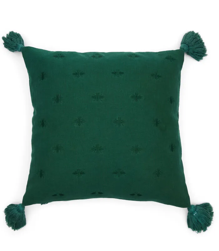 Verspreid over deze Barberini Bee–kussenhoes vliegen met de hand geborduurde bijen. Het groene katoenen kussen heeft op alle vier de hoeken sierlijke kwastjes en in de rechteronderhoek schittert het gouden Rivièra Maison–handelsmerk. De rits is onzichtbaar in een naad weggewerkt. Exclusief binnenkussen.