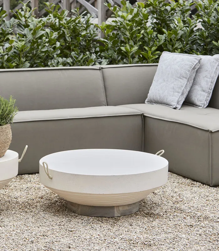 De Jimbaran Outdoor Coffee Table D80 is een lage bijzettafel voor op je terras of in de tuin. De stoere, witte salontafel voor buiten heeft een diameter van maar liefst 80 centimeter en is ook verkrijgbaar in een kleinere variant van 60 centimeter. De ronde tafel is gemaakt van glasvezel en teakhout.