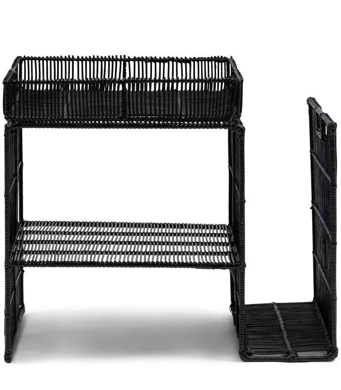 Prachtig met de hand gevlochten bijzettafel met een standaard voor tijdschriften en kranten eraan vast. Het tafeltje is gemaakt van van zwart gespoten rattan, in een zwart metalen frame. Bovenop het tafeltje ligt een los blad, dat kan worden gebruikt als dienblad.