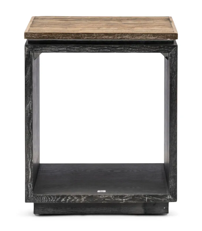 Dit is de Saratoga Hills End Table, een vierkante, handgemaakte bijzettafel met een blad van gerecycled eikenhout. Dit materiaal geeft een robuuste uitstraling en maakt ieder tafeltje uniek. Het frame is ook gemaakt van hergebruikt eikenhout, maar dan in de kleur zwart. In de Saratoga Hillsâserie zijn ook andere meubels verkrijgbaar.