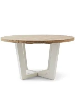 Ronde eettafel voor buiten, voor die heerlijke zomerse dagen. Het glad afgewerkte tafelblad is van dikke teakhouten panelen, de vier poten die onderaan een stevig kruis vormen, zijn van aluminium en zijn er in twee kleuren. De diameter van deze tafel is 140 cm, dus daar kunnen wel een paar mensen aan zitten.