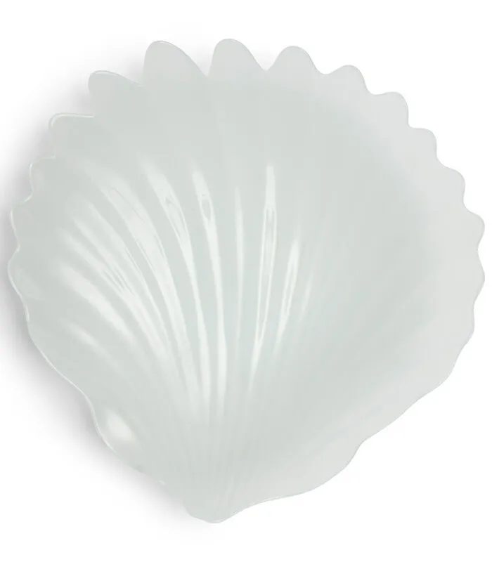 Glazen schaal van melkglas, dat is de RM Beach Shell Serving Plate. Voor op het strand geïnspireerde hapjes, of, helemaal leuk, een hele schaal vol schelpdiertjes. Natuurlijk kan de schaal ook een ander doel dienen.