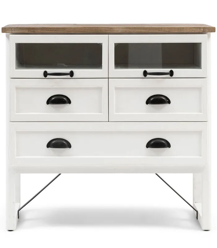 Een ladekast gemaakt van een combinatie van gerecycled essenhout en populierenhout. De ladekast heeft frontjes van glas en metalen grepen in twee stijlen. De voorkant is wit geschilderd, het bovenblad heeft een natuurlijke bruine tint. Er is hier ook een grotere uitvoering van.