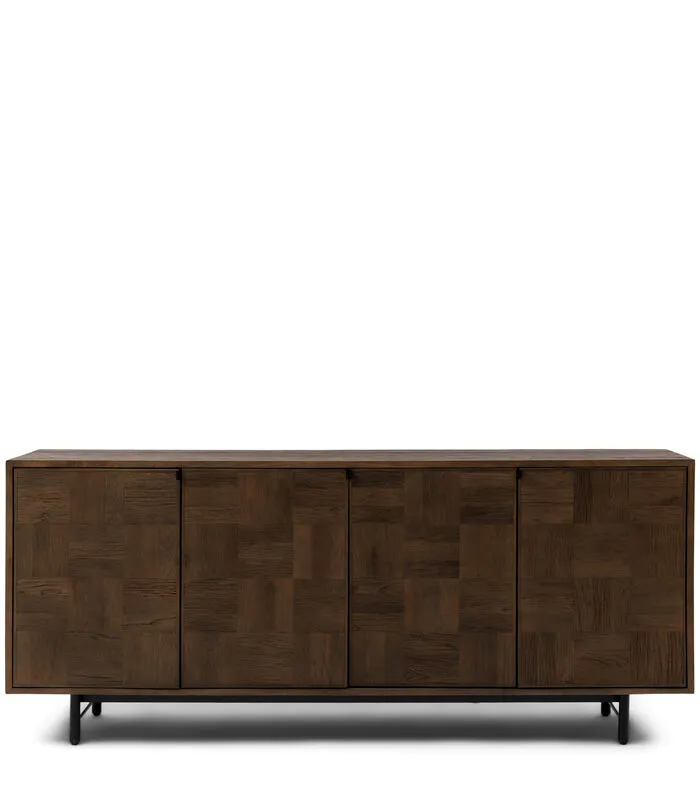 Robuust en toch luchtig, dan heb je het over dressoir Mac Arthur. Dit dressoir staat op donkere metalen pootjes, wat voor de luchtige uitstraling zorgt. De kastdelen zelf zijn gemaakt van prachtig, gerecycled eikenhout, dat om en om in vierkanten is ingelegd. Achter twee van de vier softclose deurtjes zit ook nog een lade.