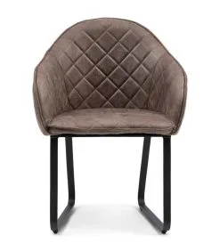 Wat een heerlijke eetkamerstoel met armondersteuning. Mooi bekleed met de stof pellini, in de kleur Coffee en een diamantvormig stiksel erin verwerkt. In de rug is de stoel rond gevormd, daardoor heeft hij veel zitcomfort. De metalen sledepoten geven de stoel iets industrieels.