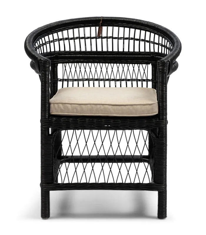 De Victoria Falls Dining Armchair is een luxe, zwarte eetkamerstoel gemaakt van rattan. De rattan stoel wordt helemaal met de hand gemaakt en gevlochten in Indonesië. De zwarte stoel heeft armleuningen die doorlopen in de rugleuning. De comfortabele eetkamerstoel wordt geleverd met lichtgekleurd, katoenen kussen.