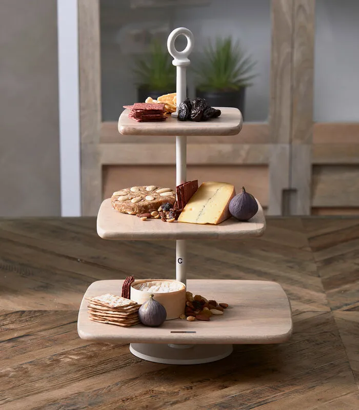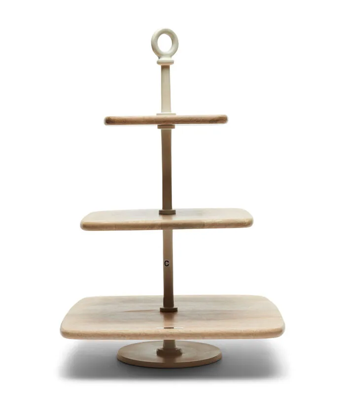 Wie van etagères houdt, kan niet om deze Côte Des Basques Etagère heen. Handgemaakt van duurzaam mangohout, met een matte finish afgewerkt. De drie vierkante plateaus hebben uniek afgeronde hoeken. De standaard is van off white aluminium en heeft een handige draagring.