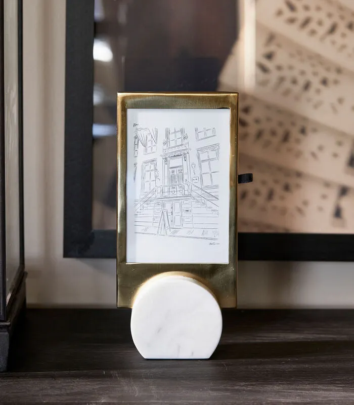 Fotolijst Depsey is een staande lijst voor een foto van 10×15 cm. De lijst staat in een ronde, witte, marmeren voet en heeft zelf een gouden finish. De lijst kun je uit de voet halen en heeft wat weg van een klassieke polaroid.