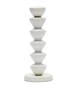 In een prachtige matwitte tint is dit de RM Isla kaarsenhouder. Op het eerste oog een keramieken kandelaar, maar… verrassing, hij is van massief aluminium. De witte coating geeft hem die unieke uitstraling, samen met de vorm die bestaat uit gestapelde driehoekjes, met in de bovenste een uitsparing voor een dinerkaars.
