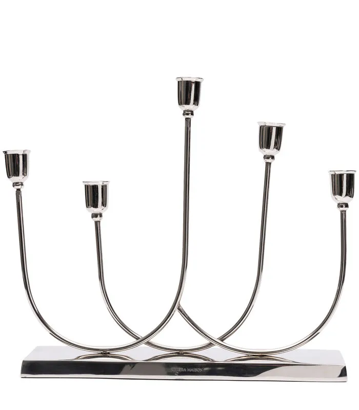 De Chateau d’Eau kaarsenstandaard heeft maar liefst vijf armen. Deze kaarsenstandaard van zacht glanzend aluminium is een sieraad op tafel of elders in huis. De kaarshouders hebben elk een klein randje, waardoor eventueel druipend kaarsvet niet over de standaard spettert. Alle dinerkaarsen van Rivièra Maison passen hierin.