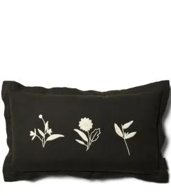 De RM Zephyrus Pillow Cover 50×30 is een zwart linnen kussenhoes voor een kussen van 50 x 30 centimeter. Via de ritssluiting aan de achterzijde kun je eenvoudig een binnenkussen plaatsen. De zwarte kussenhoes is gedecoreerd met drie bloemen en afgewerkt met een brede bies. De achterkant is effen.