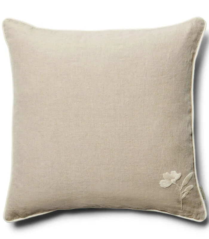De RM Zephire Pillow Cover 50×50 laat zich het beste omschrijven als een beige linnen kussenhoes met een bloemdecoratie en een witte bies. De achterzijde is effen en hier bevindt zich ook de blinde rits, die nauwelijks zichtbaar is. Deze stijlvolle kussenhoes past om ieder binnenkussen van 50 x 50 centimeter.