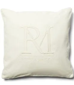 De RM Monogram Pillow Cover 50×50 is een chique kussenhoes in wit katoen. Aan de voorzijde is het RM–monogram geborduurd in wit, wat duidelijk zichtbaar en voelbaar is dankzij de dikte van het borduursel. De achterkant is effen wit. De bies is voorzien van een ronde piping.