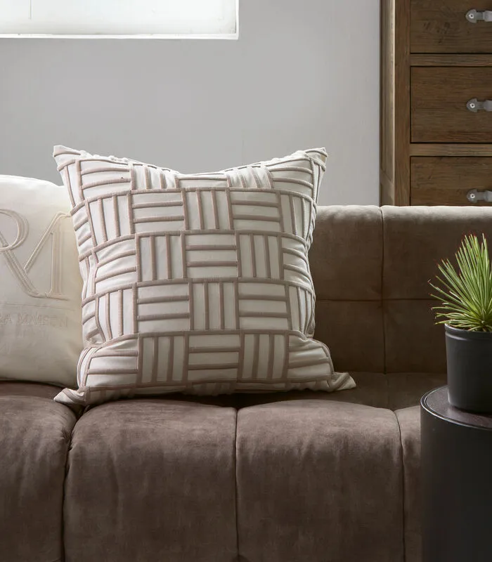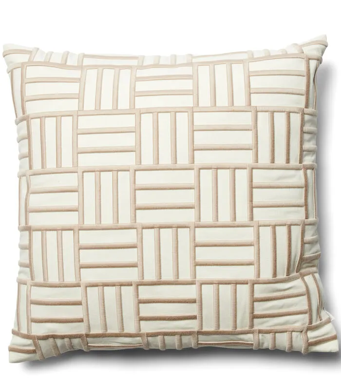 De RM James Pillow Cover is een grote kussenhoes van 60×60 centimeter. De hoes is gemaakt van een sterk katoen in gebroken wit. Op de hoes is met glanzende, beige garen een grafisch blokpatroon geborduurd. Het patroon bestaat uit verticale lijnen die worden afgewisseld met horizontale. De achterzijde van de hoes is effen.