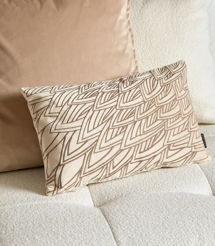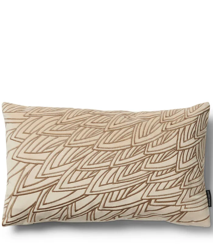 De Flower Petals–kussenhoes is geschikt voor een rechthoekig kussen van 50 bij 30 centimeter. Aan de voorkant van het velvet kussen zijn wuivende bloemen bladeren geborduurd. De achterkant van het kussen is egaal en eveneens van het zachte velvet–materiaal. Langs de lange zijde is de rits onzichtbaar in de naad verwerkt. Exclusief binnenkussen.