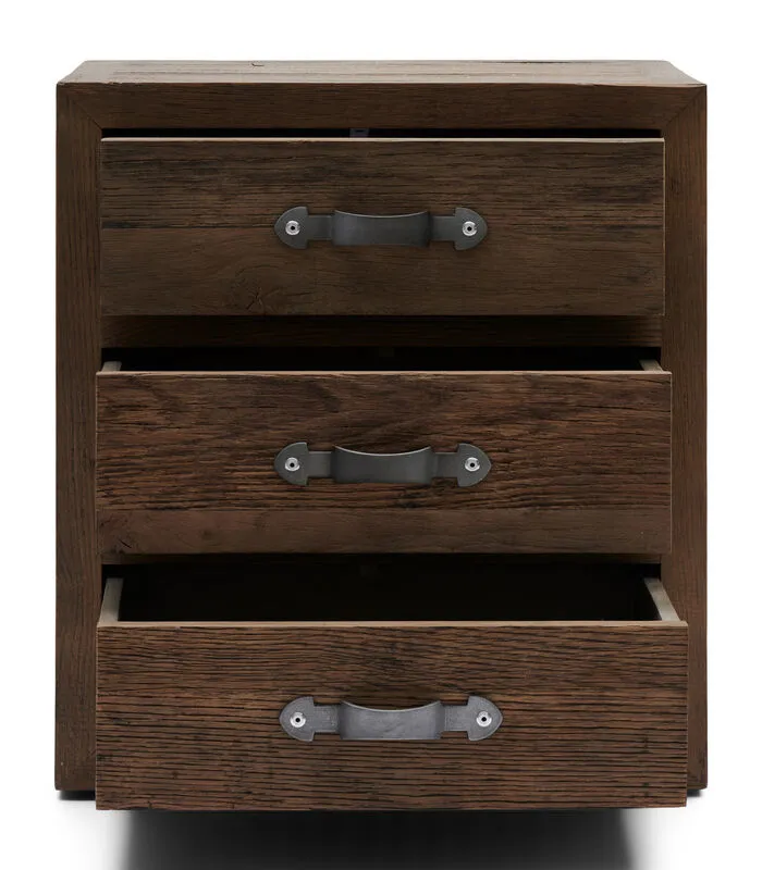Ladekastje dat kan worden gebruikt als nachtkastje of als een bijzetkastje. Het kastje is gemaakt van gerecycled essenhout en hout van twee dennensoorten. De lades hebben industriële handgrepen van metaal, wat het kastje een stoer uiterlijk geeft. De Connaught Chest of Drawers is in elk interieur een fraaie toevoeging.
