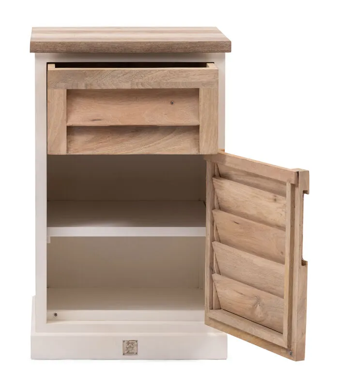 Neem de Pacifica–serie mee de slaapkamer in met dit nachtkastje uit deze luchtig ogende serie. De meubelen uit deze collectie zijn allemaal gemaakt van mangohout in naturel en met een witte coating. Opvallend is de ‘shutter–look’ die in dit nachtkastje is verwerkt in een lade en deurtje met lamellen. Verkrijgbaar in een linker– en een rechtervariant.