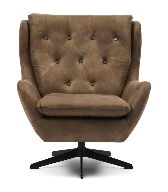 Deze draaibare stoel oogt een beetje als een stoel uit de jaren zestig, maar heeft alle eigenschappen van een comfortabele relaxfauteuil van nu. Onder de draaistoel staat een zwart, ijzeren onderstel. De stoel is verkrijgbaar in meerdere kleuren pellini leer. Dit is de variant in ‘Camel’.