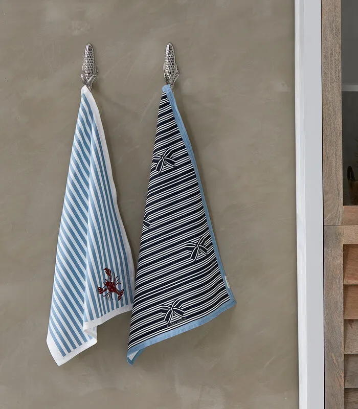 Met de twee RM Nautic Theme theedoeken hoef je niet de woeste baren te bevaren, al brengen ze je wel in de stemming. De lichtblauw gestreepte heeft een borduursel van een kreeft, de donkerblauw dwarsgestreepte theedoek heeft een strikpatroon erin verwerkt, waarvan ook serviesgoed is.