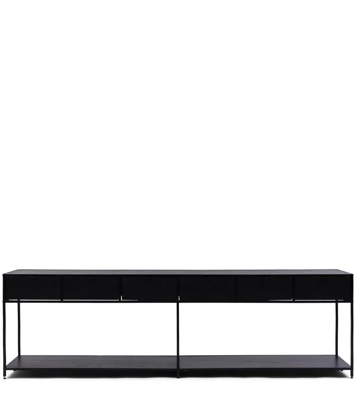 Tv–meubel The Bobby is een multifunctionele, lage kast. Dit dressoir is ontworpen om laag genoeg te zijn om er een tv boven te hangen, maar ook een mooi kunstwerk misstaat natuurlijk niet. Of plaats hem achter de bank als sidetable, de keus is aan jou. Daarnaast springt het donkere fineer van essenhout in het oog, evenals de zes handige lades.