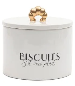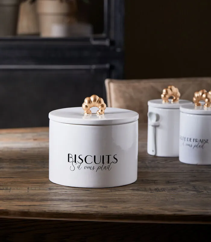 Deze voorraadpot van wit porselein voorkomt dat jouw koekjes slof worden. Door de siliconen ring aan de binnenkant van het deksel, sluit de voorraadpot goed af en blijft alles wat je erin bewaart langer vers en krokant. Een goud croissantje vormt de handgreep op het deksel.