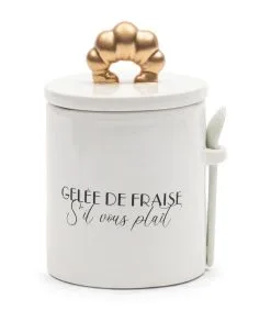 Wil je eens iets anders dan een glazen jampot op tafel? Bewaar je confituren dan in deze porseleinen voorraadpot. De siliconen ring zorgt ervoor dat het deksel de pot goed afsluit en dat alles wat je erin bewaart, langer vers blijft. De greep van het deksel is een gouden croissantje, waaraan je het deksel eenvoudig optilt.