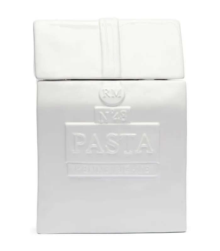 De Pasta Storage Jar voor alle pasta. Laat ‘la mamma’ of ‘il papà’ maar eens lekker aan de slag gaan. Dat wordt smullen straks. De witte keramieken pot is gedecoreerd met letters en RM–logo in reliëf. De licht golvende zijkant maakt de pot speciaal.