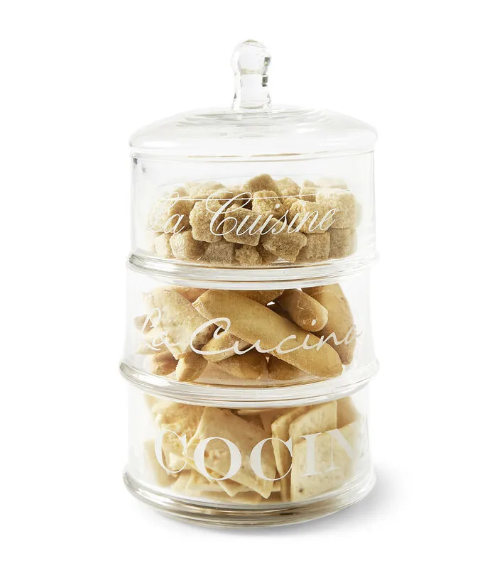 Deze mooie voorraadpot is met recht een van de bestsellers van Rivièra Maison. De pot heeft drie verschillende compartimenten waarin u van alles kunt bewaren; zoetigheden, koekjes, suiker of bijvoorbeeld muesli. Op de drie delen van de pot staat in verschillende stijlen in het Frans, Italiaans en Spaans ‘de keuken’ geschreven.