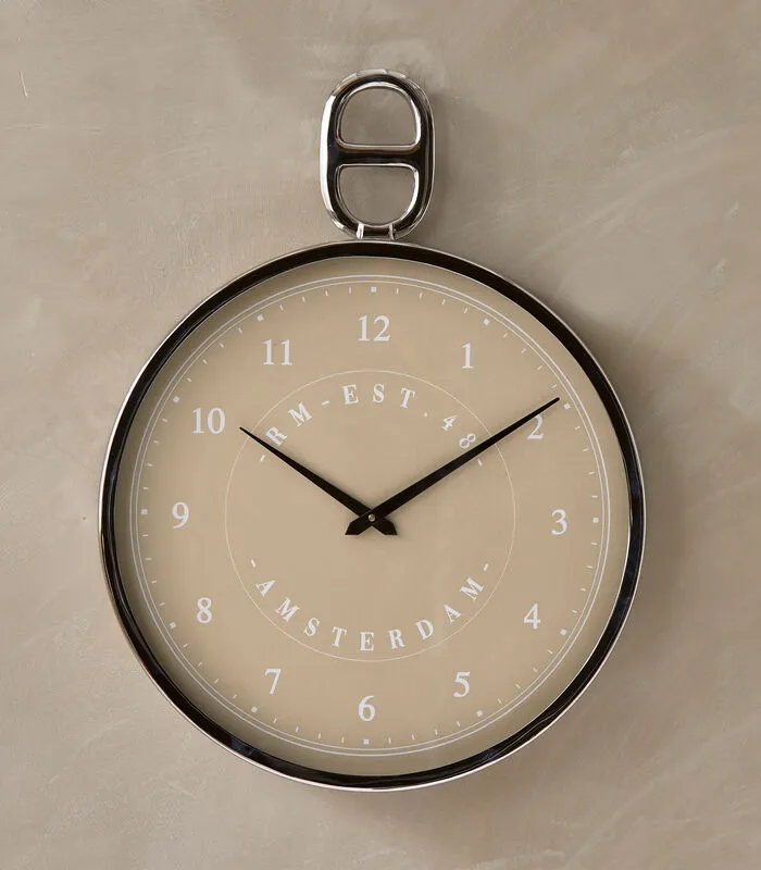 De RM Emily Clock is een ronde wandklok met een metalen rand en een beige wijzerplaat. Op de wijzerplaat staat geschreven ‘RM – EST. 48, Amsterdam’, verwijzend naar het begin van Rivièra Maison. De wijzers van de klok zijn zwart en de nummering is wit. De ronde klok is gemaakt van aluminium, roestvrij staal en glas.