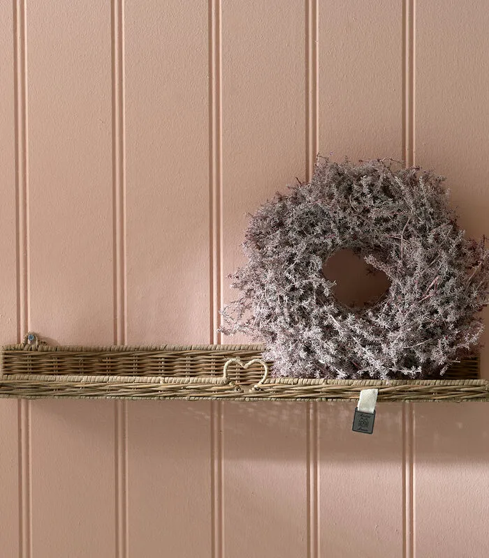Een smalle wandplank kan net genoeg zijn voor het organiseren of decoreren van enkele spulletjes. Voor dit doel is de Rustic Rattan With Love Decoration Shelf gemaakt, met het RM–beeldmerk aan een canvas lus. De handgevlochten plank is van stevig rattan en pitriet en voorzien van twee rattan haakjes om hem meteen te gebruiken.