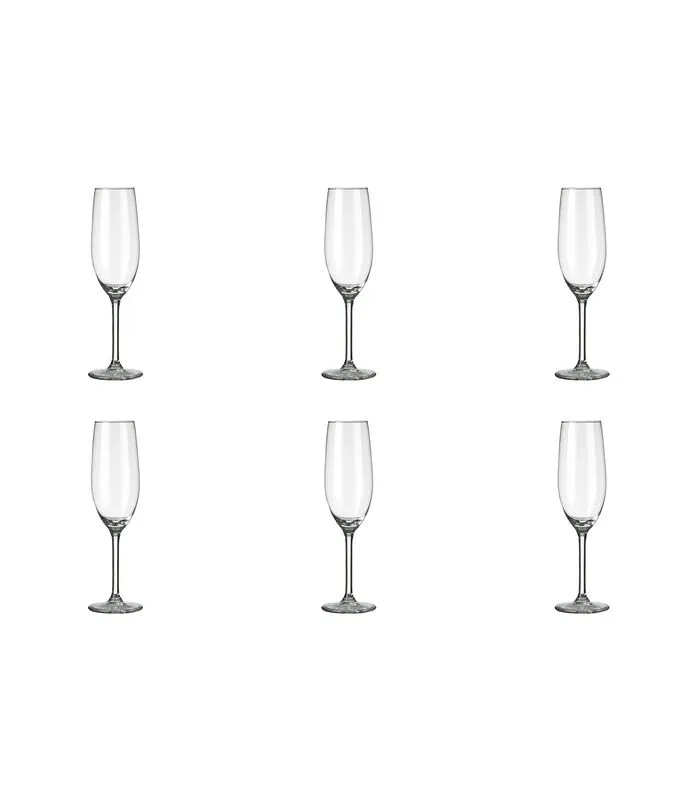 Deze chique L’Esprit du Vin champagneflûtes van Royal Leerdam passen perfect in iedere tafelsetting. Door het heldere glas van hoge kwaliteit worden de bekende bubbels in de champagne goed zichtbaar. De korte steel geeft de glazen meer stabiliteit. De wat bollere hoge kelk zorgt ervoor dat de bubbels ook lang aanwezig blijven in de champagne. Bovendien zijn deze glazen naast hun perfecte uiterlijk ook zeer praktisch, want na gebruik kunnen ze zo de vaatwasser in. Deze set bestaat uit 6 transparante champagneflûtes met een inhoudsmaat van 21 cl.